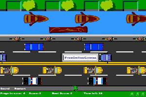 快来帮助小青蛙在规定时间内穿过公路和小河安全到达对岸的四个空地上吧!